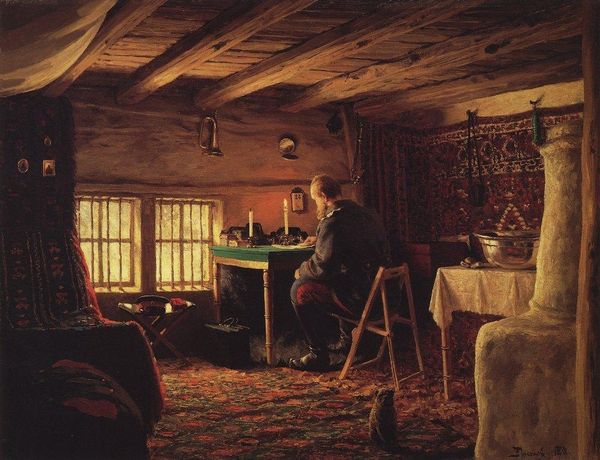 Ilya Repin made this oil painting, “Putting a Propagandist Under Arrest,” using traditional artistic materials to capture a politically charged scene. The somber palette, dominated by browns and blacks, is built up through layers of paint, applied with visible brushstrokes. The texture of the paint contributes to the overall mood, conveying the weight and grimness of the situation. Repin skillfully uses light and shadow to guide our eyes, emphasizing the tense atmosphere. The making of the piece, with its meticulous detailing and attention to realism, underscores Repin's engagement with social issues, especially the lives of ordinary people. Repin's artistic choices reflect a desire to use his craft as a form of social commentary. Paying attention to the materials, making, and context encourages us to look beyond traditional distinctions between fine art and craft.