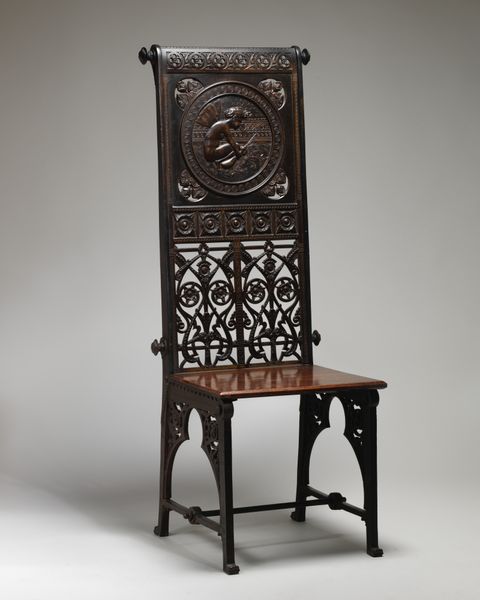 Christopher Dresser, a trained botanist who became one of the first industrial designers in Britain, promoted innovative design available to many social classes through inexpensive, mass-produced objects. The stylized palms and thistles on the back of the chair also appear on the cast-iron coatstand that Dresser designed for Coalbrookdale Company. The trompe l'oeil (fool the eye) tufted seat is recorded on an 1868 design registered by the Masborough Stove Grate Company in England. The spiral turnings on the back stiles and legs, crocket finials, and geometric patterns suggest an assortment of Elizabethan, Gothic, and Renaissance revival motifs in vogue in both America and Europe during the 1860s and 1870s.