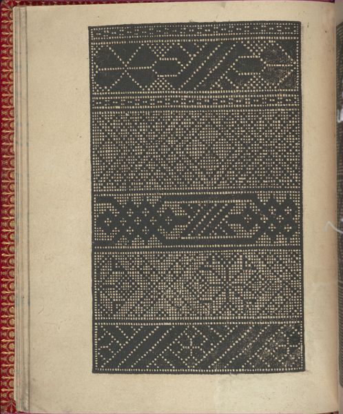 Editor: This is page 6, verso, from "Ce est ung tractat de la noble art de leguille ascavoir ouvraiges de spaigne," dating from 1527 to 1540, and attributed to Willem Vosterman. It's a woodcut print showcasing various geometric patterns. It feels incredibly methodical, almost mathematical. What do you make of this piece? Curator: Well, beyond the geometry, let’s consider the social context. This wasn't simply decoration; it was a pattern book for needlework, offering designs specifically for Spanish embroidery. Embroidery, at that time, was very much a woman’s art. Editor: So, you're saying this book functioned almost like a subversive textbook? It was disseminating these patterns which allowed for self expression and even maybe a challenge of the dominant political status quo? Curator: Exactly. Consider the power dynamics at play: while women were often excluded from formal artistic training, they could express creativity and skill through textiles, potentially signaling status or quietly conveying personal narratives, or reinforcing it. And these pattern books provided a means of accessing and sharing that knowledge. Editor: It’s amazing to think about how something seemingly decorative can be so deeply intertwined with social and gender dynamics. Curator: Precisely! It challenges the conventional art history narrative that often overlooks these forms of cultural production. Editor: This has totally reshaped how I see this page. It's not just geometric design. I think this perspective completely changed my idea of medieval artwork. Curator: And that’s the goal. Art isn't created in a vacuum, and examining it through multiple lenses helps us appreciate its depth.