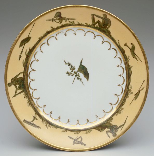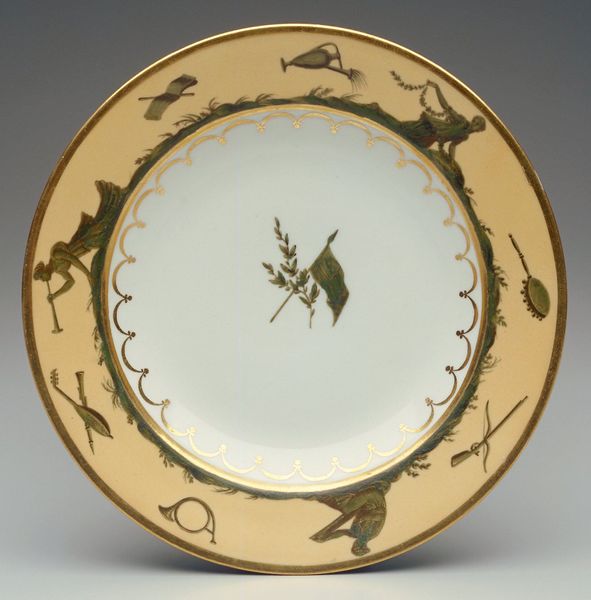 Curator: Let's discuss this intriguing "Plate," crafted around 1880 by the Worcester Royal Porcelain Company. You can find it here at the Minneapolis Institute of Art. Editor: My immediate reaction is one of delicate opulence. The gold against the stark white porcelain really pops. The bird figure gives me an immediate sense of calm and perhaps fleeting elegance. Curator: Interesting take. Looking closer at the material reality, it’s porcelain, which, even then, spoke volumes about class and access. Porcelain production, its chemical composition and firing process, was intensely controlled. Editor: Yes, and the symbols are intriguing. We have the crane, wings outstretched, traditionally a symbol of longevity and happiness in East Asian cultures, juxtaposed with various flora. This feels almost like a western interpretation—a Victorian fascination with the "Orient." Curator: Precisely! This object screams “Orientalism.” The labor involved in sourcing the materials, the design itself – a pastiche of motifs simplified and recontextualized for a European market. The whole aesthetic suggests this period of cultural appropriation. Editor: But the aesthetic itself can't be dismissed entirely. Consider how the stylized depictions of nature reflect the Pre-Raphaelite movement, which heavily focused on nature. Those leaves carry layers of association; do they suggest something darker beneath the gilded surface? Curator: Possibly, but remember who consumed such wares. These weren't necessarily radical thinkers but the bourgeoisie, whose understanding of ‘the exotic’ was limited. I think the Pre-Raphaelite comparison might stretch it a bit. It’s mainly for decor and ostentation. Editor: I disagree somewhat; there’s more than mere wealth on display. Symbols carry a deeper charge. The specific arrangements, choice of bird, flower, and leaves—those create symbolic stories. This object could mean far more to an individual owner. Curator: You're seeing poetry where I see production methods and capital, perhaps? Editor: Maybe, or perhaps both perspectives allow a more encompassing view. Curator: Agreed. Ultimately, whether this plate primarily serves as a vessel for exoticism or complex symbolism, it undeniably tells us a lot about that specific moment in time. Editor: Indeed. A material thing charged with culture, memory and… artistic license.