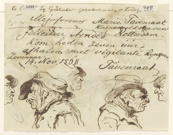 Editor: This is "Koppen," a pen and ink drawing from somewhere between 1840 and 1880, by Johannes Tavenraat. It's at the Rijksmuseum. It's... odd. They all seem like grumpy caricatures. What do you see in this piece? Curator: It's fascinating how Tavenraat captures character with just a few strokes. Note the repeated visual element of the hat. In many cultures, hats were far more than practical items. They represented social status, occupation, even moral standing. These sketches might be read as social commentary. What feelings are evoked as you examine their different styles of headwear? Editor: I hadn't really thought of that! Some seem very proper, like the tall chef's hat. Others are more…common. Curator: Precisely! And consider the date scrawled on the drawing: "November 1790." This date precedes the work by a few decades, suggesting the artist sought to capture specific memories or earlier imagery within a newer context. Could this then be a deliberate act of preserving a particular vision of Dutch society as it once was, or perhaps a critique of its transformation? How does this possibility impact your view? Editor: Wow. So it's like the artist is saying, "Remember these types?" It makes them feel less like random sketches and more like historical figures. Curator: Indeed. And what of their expressions? They look disapproving or concerned, almost haunted, like the weight of the past is visible. That could invite deeper interpretations. Art can be about the seen and unseen—it allows an image to exist in our minds and influence our decisions long after its creation. Editor: This has totally changed how I see the drawing. It's not just faces; it's history. Curator: Precisely. This artwork can continue teaching viewers about cultural norms and histories, centuries later.