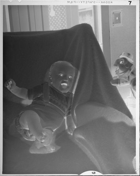 Editor: This is an untitled photograph by Lucian and Mary Brown, depicting a boy mid-jump in a Superman costume. The negative exposure gives it an eerie, dreamlike quality. What formal elements strike you most? Curator: Observe how the composition leverages the figure's dynamic pose. The stark inversion of light and shadow underscores the tension between the mundane domestic setting and the fantastical aspirations embodied by the Superman persona. Note, too, the cropping which accentuates the subject's gesture. Editor: So, you're seeing a deliberate interplay between form and content? Curator: Precisely. The formal construction amplifies the thematic exploration of identity and aspiration. Editor: I never considered the formal construction to reflect the thematic elements. Thank you! Curator: Indeed, a rewarding analysis.