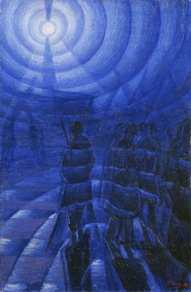 Curator: It strikes me as something ancient, almost primordial—dark and a bit unsettling. Editor: Then let’s shed some light. This is Hanno Karlhuber's "The Hermit's Friend" from 1987, rendered in acrylic paint. I'm curious about your sense of unease. Curator: Well, the subject matter: stacked rocks lit by an ethereal glow in an otherwise desolate landscape. There's an implied narrative of isolation that feels potent in our hyper-connected world. Editor: True. Karlhuber’s engagement with neo-expressionism is evident, particularly in the textures. I see layers, the way the paint’s been applied, as very deliberate, emulating the weight and form of these large boulders. The means of its construction reflecting the weight of its subject. Curator: Precisely. It transcends simple representation. It speaks to the emotional weight of being, perhaps commenting on ecological devastation through the lone figure in contrast with their natural surroundings? Is that "friend" a metaphor? Is nature a true solace, or a stark reminder of human impact? Editor: Interesting. For me, the question becomes one of how our interpretation is shaped through those heavy, carefully applied strokes of paint. Consider acrylic's emergence and its implications. Here, in Karlhuber’s work, we're not merely viewing a landscape; we are experiencing a mediation between mass production and manual artistry. The work challenges any binary between nature and the artificial. Curator: So you are seeing Karlhuber intentionally highlighting his own process? Editor: Yes, foregrounding process to question nature's “naturalness.” His method becomes as relevant as the landscape depicted. That light is both alluring and unnatural in tone, illuminating only hard edges. Curator: It pulls us into questioning those spaces of tension between solitude, our relationship to nature, and whether or not solace is truly available. Editor: Indeed, and by understanding its construction, and its place within contemporary art and culture, it opens broader questions of both being and making, and what is “natural”.