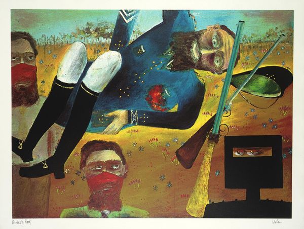 Curator: Sidney Nolan's striking image, "Death of Constable Scanlon," immediately strikes one as a study in contrasts. The textures, especially, create a dynamic tension. Editor: Absolutely, there's such a visceral sense of the act of painting itself, isn't there? You can almost feel the thickness of the paint, the roughness of the application, contributing to this unsettling scene. Curator: Note how Nolan uses compositional devices to amplify narrative. The inverted figure, for example, speaks to a disruption of order. Editor: And look at that stark, silhouetted figure of Ned Kelly—almost like a cutout, a stark contrast to the impressionistic handling of the landscape. The painting's materiality enhances the starkness of the legend itself, doesn't it? Curator: The artist has imbued the work with a sense of mythmaking. Editor: It's as if the painting acknowledges its own status as a constructed narrative, its materials—paint, canvas—serving as tangible reminders of the labor involved in shaping our understanding of history.