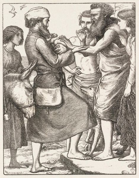 This is Sir John Everett Millais's "Pearl of Great Price." The black and white drawing depicts a merchant displaying his wares. The scene explores economic and spiritual exchanges. Millais was a central figure in the Pre-Raphaelite Brotherhood, a group known for its detailed, naturalistic depictions and its engagement with moral and social issues. Millais's art often questioned Victorian values, especially regarding wealth and piety. This piece reflects anxieties about materialism versus spirituality. Who determines the value of something? Who has access to it? The barefoot figures and the modest garments contrast with the implied opulence of the pearl. This highlights class disparities and challenges the viewer to consider ethical questions about the pursuit of wealth. The emotional resonance of this piece lies in the silent negotiation of value, and the tension between worldly and spiritual desires.