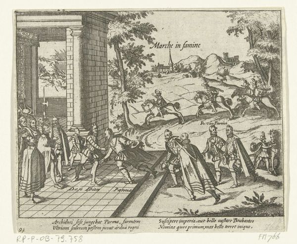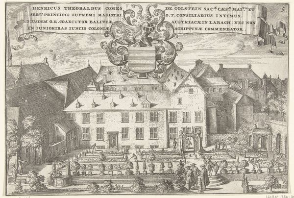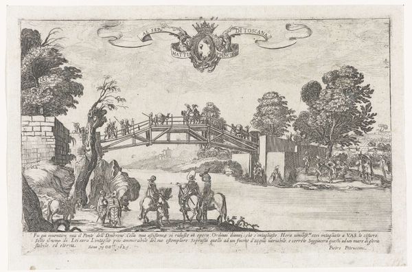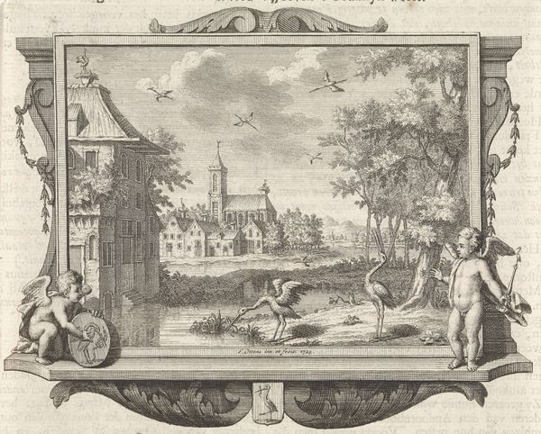 Curator: Look at this detailed drawing of Gezicht op kasteel Bekkevoort by Romeyn de Hooghe, created around 1700. It's currently housed in the Rijksmuseum. The work combines pen and ink with etching, typical of the Baroque landscape style. What strikes you initially? Editor: The immediate feeling is one of… loss. The skeletal remains of what I assume is the castle, juxtaposed with the idyllic hunting scene and those imposing heraldic symbols above… there’s a stark contrast between present decay and lingering power. It hints at a deep societal tension. Curator: The heraldry certainly reinforces the artwork’s symbolism of power, but it also functions as a cultural signifier; a proud emblem linked to lineage and noble entitlement. That visual language was easily readable for contemporary audiences. Editor: I wonder how ordinary people at that time really "read" these symbols of power, given the realities of inequality. Were they inspiring or just imposing, perhaps even oppressive? It reminds me of Foucault's writings on visibility and control. The image does make you think about whose stories are deemed worthy to be visually preserved and promoted through commissioned artwork. Curator: The visual precision is astounding, the artist captured with the etching both architecture and nature surrounding the Castle, that evokes the passage of time. Observe how the drawing utilizes the heraldic emblems placed over a ruined structure, hinting at nobility enduring despite physical ruins. A very potent reminder that tangible decay doesn't diminish ideological lineage. Editor: Precisely. It begs us to examine who continues to benefit from these established symbolic narratives, even when the physical structure declines. The ruins and the hunting party at the river; these symbols are all pieces within a larger socio-political puzzle. What does that landscape become, without the idealized symbolism overlaid? Curator: For me, seeing how symbols preserve communal identities regardless of social shift resonates still today. These embedded icons remain important threads weaving societies together throughout generations. Editor: Agreed, art always functions within societal dialogues – questioning inherited values, resisting power dynamics, while, too, re-envisioning the futures, we dare to shape and forge ahead of us all.
