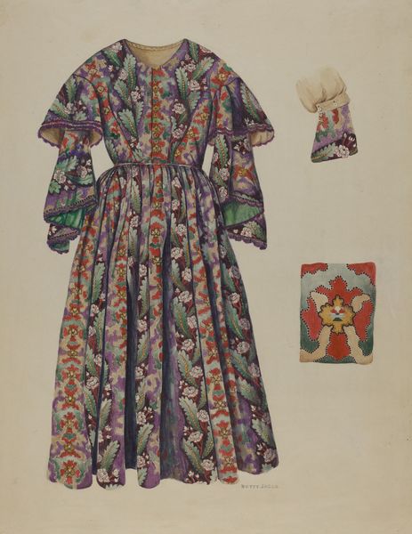 Editor: This is "Dressing Gown," circa 1936, by Sylvia Dezon. It appears to be a design sketch, watercolor and possibly textile on paper. It feels very much like a stylish blueprint from another era. What do you see in this piece? Curator: Well, first, I see a memory taking form. Think about it: watercolor possesses this fleeting quality, much like a half-remembered dream. Dezon isn't just designing a dressing gown; she’s capturing a mood, an ambiance. Can’t you almost feel the silk between your fingers, smell the lavender? Editor: I hadn't thought about it that way, but it makes sense. It's more than just the rendering of clothing. What about the floral patterns? Do they have significance? Curator: Ah, the floral motif. Classic Art Deco, wouldn’t you agree? They remind me of lazy summer afternoons, sunlight filtering through curtains, the gentle buzzing of bees. Though rendered on paper, the flowers hold a certain kineticism, as though on the verge of swaying in the breeze. Now, what feelings do the colours themselves stir in you? Editor: They're quite muted and restrained. Peaceful, maybe a little melancholy? Curator: Precisely! It's not just visual, is it? The gown hints at quiet moments of contemplation, self-care rituals – a silent pause amid the bustle of life. Art Deco often gets pigeonholed as glitz and glamour, but here, we find intimacy, haven’t we? Editor: That’s true. I initially saw it as just a pretty drawing, but now it feels like a portal into someone’s personal space and time. Curator: Exactly! That’s the funny thing about art; it begins as the artist's singular vision, and yet through empathy, observation and reflection, a little piece becomes ours, too.
