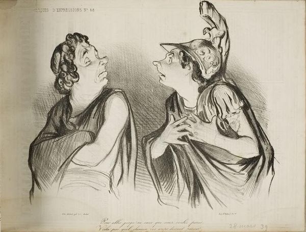 Editor: This lithograph by Honoré Daumier, "I am young, it is true," presents two figures with exaggerated features. It feels like a comedic commentary on aging, but I'm not sure I fully grasp the context. What can you tell me about this piece? Curator: Daumier was a master of social satire. His work often critiqued the bourgeoisie and political figures of 19th-century France. How do you think this print might reflect the social dynamics of the time? Editor: Maybe it’s about the vanity of clinging to youth in a society obsessed with appearances? Curator: Exactly. Daumier used caricature to expose societal flaws. The figures' expressions and gestures convey a sense of desperation and self-deception. This print makes me consider the role of art in holding a mirror up to society. Editor: That’s insightful. I see it now as more than just a funny image, but as a commentary on the anxieties of its time. Curator: And perhaps anxieties that continue to resonate today.