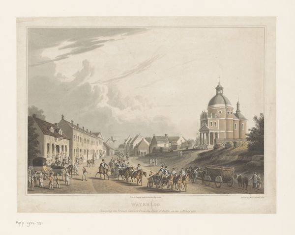 Editor: This is Leopold Beyer's "View of the Coffee Houses opposite the Bridge between Vienna and Leopoldstadt," likely made sometime between 1801 and 1877. It's a watercolor, and I find it really interesting how much daily life it captures, like a snapshot of 19th-century Vienna. What do you see in this piece? Curator: I see a visual document, reflecting Vienna's social stratification during that era. Look at the clear delineation between those enjoying leisure at the coffee houses and those, likely laborers, working by the water. The bridge itself is a fascinating symbol here. Editor: How so? Curator: Bridges are connectors, but who crosses them and for what purpose? Are these coffee houses truly spaces of public gathering, or are they subtly regulated sites of class performance? Consider also the military presence – a subtle reminder of state control amidst this seemingly innocent scene of everyday life. What does this imagery say about who has access and who is being surveilled? Editor: I never thought about it that way. I was focusing on the architecture and the style. You’re right; it isn’t just a simple scene. The uniforms, the way people are posed...it definitely speaks to power. Curator: Exactly. And watercolor, despite its delicate appearance, can be a powerful medium for social commentary, especially when depicting urban spaces that are themselves sites of constant negotiation and contestation. It prompts the question of who is represented, and whose stories remain untold? Editor: This really shifts my understanding. I initially saw a pretty cityscape. Now I am noticing the dynamics of class and control embedded in what I initially perceived as 'daily life'. It’s sobering, but it adds so much depth. Curator: Art has that power; to make us question our assumptions and see the world through different lenses.