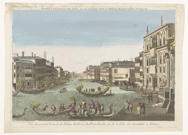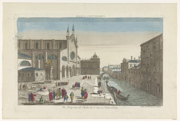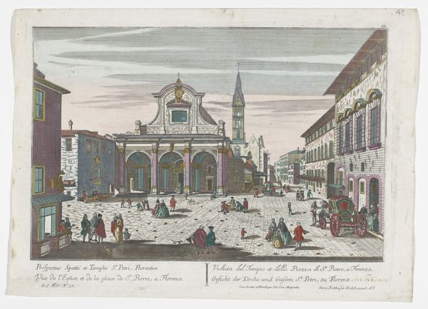 Editor: So, here we have "View of the Theatre of Marcellus in Rome," an etching and engraving by Jean-François Daumont, made sometime between 1745 and 1775. I’m struck by the way the artist uses perspective to draw you into the city. What do you see in this piece? Curator: Immediately, I notice the Roman theatrical structure coexisting with elements of the everyday. The ancient architecture isn't presented in isolation but integrated into the city's current life. Notice how the figures populate the scene; what symbolic meaning do you derive from them going about their lives, in front of something ancient and crumbling? Editor: Well, I guess they are unaware or perhaps indifferent, and mostly concerned about their own business. The past and present are sort of superimposed, maybe? Curator: Precisely! Consider how the theater, a symbol of Roman power and entertainment, becomes a backdrop, a relic. The human figures represent a continuous narrative. Think of ruins not as dead objects, but places where memories resonate through time and impact the present. Is there something hopeful in this kind of layering of time, where ordinary people are still present in the streets? Editor: I hadn’t thought of it that way, but it does give the image a sense of ongoing life. So the theatre isn't just a ruin, it's part of Rome's, and people's, everyday existence. Curator: Daumont reminds us that the past continues to live in and shape our present; by depicting the Theater, an emblem of public life and entertainment in a state of decay, a new cultural landscape forms which tells stories across generations. What do you think you’ll take away from this image? Editor: I’ll definitely think more about how artists use ancient structures not just as historical markers, but as a lens through which we understand contemporary culture. Thank you.