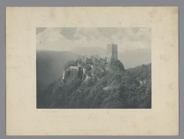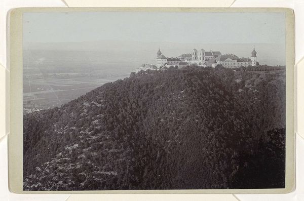 Editor: This gelatin silver print, titled "Gezicht op de Borobudur" by Adeline Andrea du Celliee Muller, was likely taken between 1930 and 1940. There's such a subtle gradation of tone, capturing a landscape dominated by those temple structures. What compositional elements stand out to you? Curator: Immediately, I observe the strategic arrangement of forms. The photograph divides into distinct horizontal zones: the intricate stonework of the foreground, the dense mid-ground foliage, and the ethereal mountains of the background, all united by the monochromatic tonality. This layering creates a sense of depth and visual rhythm, compelling the eye to traverse the picture plane. Do you notice how the artist's point of view lends a geometric abstraction to a historical setting? Editor: I hadn't considered that level of formal interplay! I was mainly focused on the visual textures and how the lighting is so diffused, avoiding strong shadows. Curator: Precisely! The soft light across these forms reveals texture and structure with notable economy. In this light, there is an equal distribution of compositional attention which enables an interchange of landscape with architectural planes. How does the work resolve, given this exchange? Editor: It’s like Muller is less interested in presenting us with representational facts than with showing a structured play of forms using a restricted palette. Curator: You’re touching on an important realization. The work resides at the intersection of documentation and abstract expression. The choice of black and white photography encourages one to consider the tonal range as a self-sufficient subject. Editor: I’m definitely walking away with a better appreciation for how much can be communicated through pure form. Curator: And I’m reminded of the power of photographic landscapes to reveal structural subtleties within expansive spaces.
