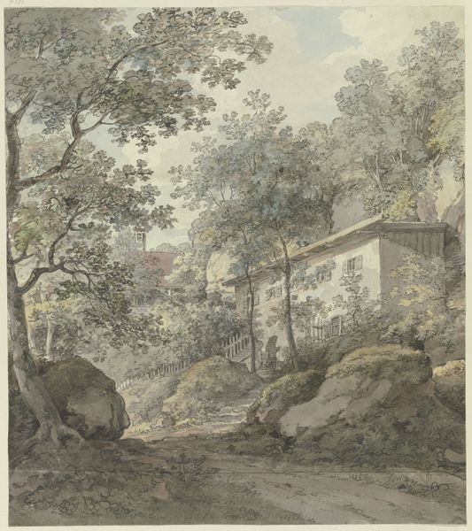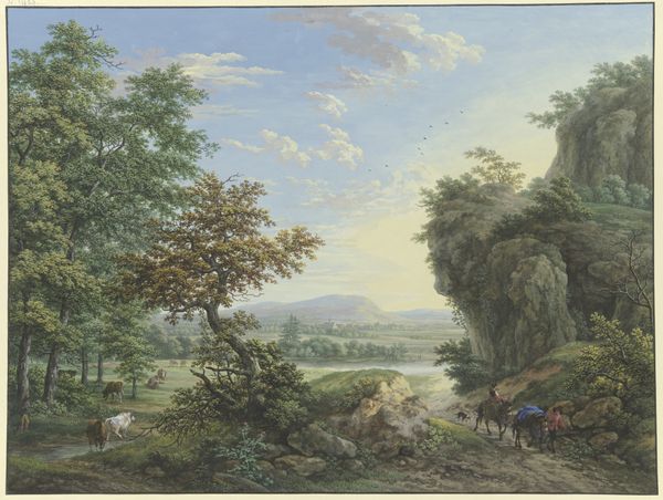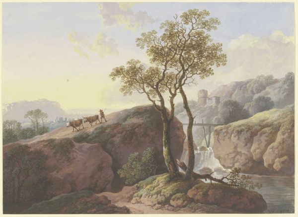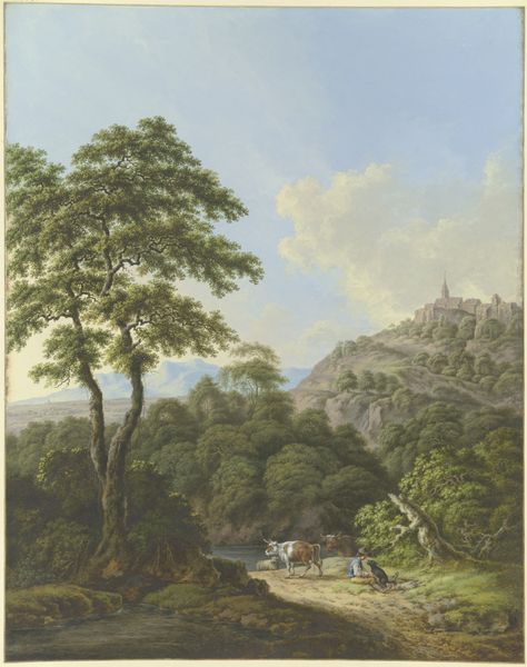 Curator: Up next we have, "Waldige Berglandschaft mit einer Burgruine, ein Hirte treibt seine Herde von der Weide" by Karl Franz Kraul. It's rendered with tempera, coloured pencil and drawing on paper and currently held at the Städel Museum. Editor: Oh, this has that dreamlike quality. The colors are soft, almost muted, giving it this ethereal feel. Like a memory fading at the edges. It gives me that longing. Curator: A certain nostalgia perhaps? What I see in this work are remnants of symbolic narratives echoing across time, look, the ruined castle speaks to fading power and time's passage. Castles are very suggestive to an older world with magic and wonder. The humble shepherd and his flock leading from the foreground show how nature persists despite shifting human fortunes. It's all about the delicate balance. Editor: Exactly! The ruins make you consider fragility and endurance together. The composition is just perfect – the way the artist positions us within the landscape, following the path up to the ruin, really brings you into the world they’re presenting to us, in this time long before photography was common, perhaps it reminded them of places like childhood homes or famous landmarks. I would love to see what Kraul's personal collection included! Curator: I imagine there would be quite the amount of illustrations there for you to sink your teeth into! The classical element cannot be overstated either, it shows a particular era of man. I imagine that is intentional on behalf of the artist and curator, showing that what's come before defines today. Editor: So true. It almost whispers to the impermanence of, well, everything. And also to what happens to a society when no one respects the values they espouse to care about. You lose so much knowledge when you cast history aside to chase modernity. And the fact that these pieces are found in the Städel Museum today is just beautiful. Curator: And isn’t that just life distilled? Seeing this piece feels a bit like eavesdropping on a very ancient, internal dialogue of humanity itself. Editor: In a way it is. It is wonderful how history keeps finding ways to tell new and younger folks the same basic tenets: "be aware of how things will pass, make hay while the sun shines, preserve and cherish what is important".