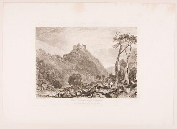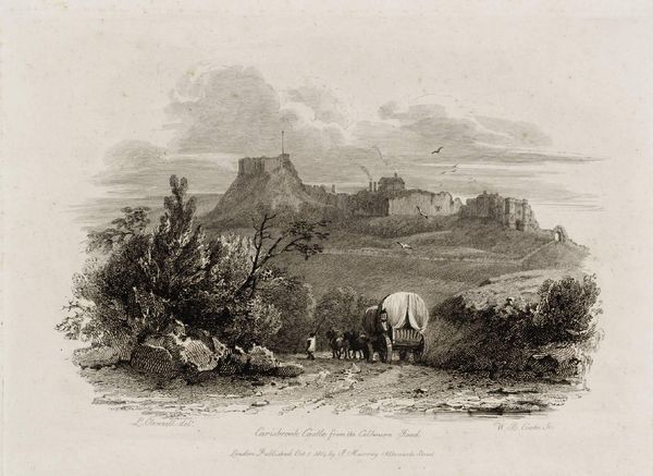 Curator: This is Luke Clennell’s "Carisbrook Castle from the Calbourn Road," part of the Tate collection. Look at the details in this miniature world! Editor: It feels melancholic. Those clouds hanging over the castle… everything seems burdened by history. Curator: Carisbrook Castle served as a prison for Charles I, so its visual representation carries the weight of political struggle and defeat. This adds another layer to the symbolism. Editor: The small wagon at the front really emphasizes that, juxtaposing everyday life against a landscape of imprisonment. What’s interesting to me is how Clennell places that history—that political tension—in relation to the common person. Curator: The castle looms; it is almost a character in the narrative. It looms over the people in the wagon. The very image evokes ideas of power structures. Editor: Absolutely. The image is a strong reminder of how history and power impact daily realities. Curator: It shows how visual markers like castles become shorthand for complex histories and power dynamics. Editor: Yes, it's a powerful intersection of place, power, and the people moving through it.