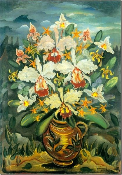 Curator: Radi Nedelchev created this vivid “Still Life with Flowers” in 1967 using acrylic paint. Editor: It's striking how the vibrant blooms jump off the canvas against that moody, dark background. There's an almost electric feel to it, wouldn't you agree? Curator: Absolutely. What fascinates me is the social context. In the late 60s, artists often embraced still life to explore the changing cultural landscape and domestic values of the era. It was a moment of re-evaluating traditional representations in the face of political and social upheaval. Editor: I see your point. But on a purely visual level, consider the bold geometric pattern of that tablecloth. The artist uses these crisp lines in contrast to the organic curves of the flowers— a push-and-pull relationship that really activates the surface. And the impasto, you can feel its materiality. Curator: And don't forget, still life paintings served as demonstrations of wealth, but I also view how the museum's acquisitions can impact perceptions, elevating what was once commonplace. The work seems to straddle Pop Art, with the boldness and flat color, and almost a Neo-Expressionist handling. The politics of taste at play… Editor: Perhaps. Still, the way Nedelchev balances the formal components, it generates an interesting tension, between flatness and depth and stillness and, again, energy. The work doesn’t rest. Curator: It is intriguing how these flower paintings found a home with modernists, they are beautiful of course, and speak to cultural currents. These visual elements, amplified in a modernist treatment, gave agency to many artists. The presentation challenges conventional ideas of feminine domesticity. Editor: True. In the end, it’s that formal complexity mixed with vivid colour that sticks with me. There's something very emotionally resonant there. Curator: Yes. And situating this work within its period, reveals a nuanced interaction of artistic tradition, cultural commentary, and the institutional dynamics that still echo today.