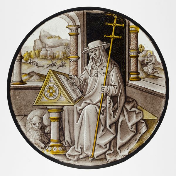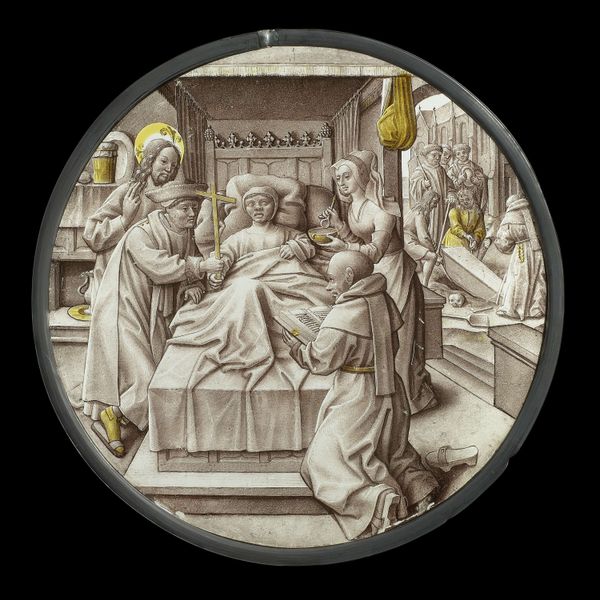 Editor: This is "Roundel with Adoration of the Magi" by Heinrich Aldegrever, dating from 1535 to 1545. It’s an engraving, and the scene is depicted within a circle. It strikes me as rather formal and rigid, not what I expect from such a tender biblical scene. What stands out to you? Curator: It's interesting you find it rigid. As an iconographer, I'm drawn to the precise symbolism at play. The roundel format itself echoes the cosmos, containing the sacred event. Consider how the magi are presented – each represents a different continent then known to Europe. Notice the varying ages and complexions – they symbolize the universality of Christ’s message. Editor: So, the artist wasn’t just telling a story but also making a point about Christianity’s global reach? Curator: Precisely. And observe the chalices the Magi offer. These aren't just gifts; they prefigure the Eucharist, Christ’s sacrifice. Each element is carefully chosen, loaded with meaning accessible to the informed viewer of the time. Do you think the use of engraving, versus painting, impacts this reading? Editor: I hadn’t considered that. Engraving gives it a certain precision, doesn't it? Like everything must be deliberate, nothing spontaneous. It definitely reinforces the sense of symbolic weight. Curator: Indeed. It allows for detailed, reproducible imagery. Religious imagery needed to be accessible, to circulate and reinforce the faith through symbols. Editor: That makes perfect sense. I initially saw it as stiff, but understanding the symbols and their distribution shifts my perspective. Thanks! Curator: My pleasure. It’s amazing how a deeper understanding of visual language unlocks such rich layers of meaning and purpose, isn't it?