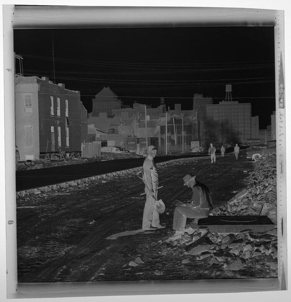 Curator: Let’s look at this stark, black and white photograph from Jack Gould, titled "Untitled (seated worker on dirt road pausing during construction)." Editor: It's such a somber image. The high contrast amplifies the loneliness of the seated worker, creating a palpable sense of isolation. Curator: The choice to photograph during construction is interesting. This undoubtedly reflects the political and economic climate, perhaps a commentary on labor and progress. Editor: Absolutely. The figure's posture, head bowed, reminds me of images of laborers during the Depression era— a symbol of weariness and the search for respite amidst hardship. Curator: It’s a compelling intersection of individual experience and broader socio-economic forces. Editor: It certainly makes you think about the human cost of building our world.