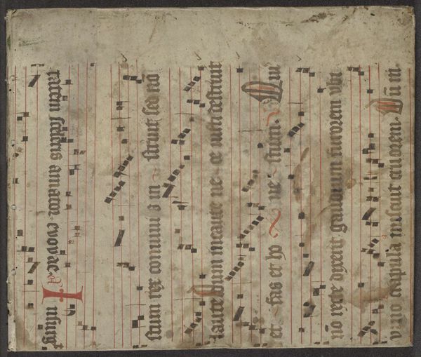 Editor: So this is Ann Gene Buckley's "Mission Chant," dating back to around 1936. It looks like ink and watercolor on paper. There's something about the neat, geometric calligraphy that’s quite beautiful, almost like looking at a carefully woven tapestry. What do you see in this piece? Curator: What a fascinating find! The neatness you mention, the way each section feels self-contained, it reminds me of medieval illuminated manuscripts—those little worlds held within pages. It’s as though Buckley's inviting us into a space where visual art meets the sacred sound, where calligraphy sings! Doesn’t the use of red make certain passages feel weightier, like whispers turned shouts? Editor: Absolutely! It highlights certain words and those little ornamented initials. It almost feels like she's created her own kind of secret code, a visual song that only certain eyes and ears could interpret, a sacred visuality. What's she chanting about? Curator: Ah, that's where it gets interesting! She could be looking at her roots to re-think modern music or sacred life and its place in modernity and consumer culture. Consider what chants even accomplish and whether there could be any sense in such repetitive acts. The work could therefore also be about re-thinking what art does, its capacity. Editor: Wow, I never considered the piece in light of those points. It definitely takes the geometricity to new heights now! Curator: Right? Sometimes the smallest pieces hold the largest worlds! I suppose the piece ultimately reflects a deeply internal musical quest of some kind! Editor: I’ll definitely look at Buckley’s work in a new light from now on! Thanks!