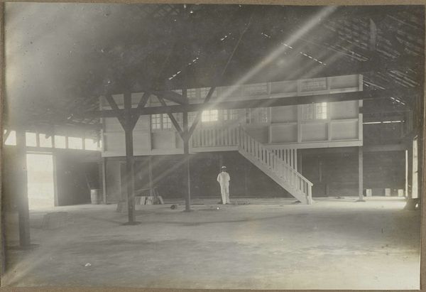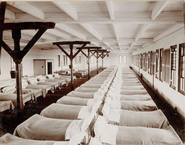 Editor: This photograph by Bass Photo, titled "Charity, Public: United States. Massachusetts. Bridgewater. State Farm: State Farm: Prison Loafing Room," is unsettling. The sheer scale of the room and the sparse furnishings amplify the isolation. What strikes you about this image? Curator: This photograph makes me consider the intersections of class, labor, and incarceration. The title "Charity, Public" is particularly poignant. It frames the state farm not as a place of punishment, but of public assistance, masking the realities of forced labor and social control. Editor: So, the title is ironic? Curator: Precisely. It invites us to question the narratives institutions create about themselves and to consider whose interests are truly being served. What does "charity" mean in this context? Editor: I see what you mean. It's a powerful reminder to look critically at the systems around us. Curator: Absolutely. It’s a testament to how visual culture can reinforce or challenge power structures.