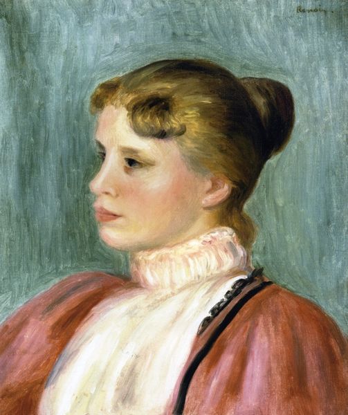 Editor: Berthe Morisot’s "Alice Gamby En Buste," painted around 1890, is simply lovely! It feels so fresh and light with these short brushstrokes. How do you see this portrait in terms of Impressionist art of the time? Curator: This work offers an interesting view into the public and private life spheres of women artists during the late 19th century. Morisot was showing professionally, but portraiture, especially of women, tended to be regarded differently than historical painting or even landscape at the time. It touches upon what was deemed appropriate subject matter for women artists. Do you find anything distinct about how Morisot positions Alice, considering societal expectations and power dynamics prevalent at that time? Editor: That's fascinating! I hadn't thought about the subject matter as a conscious choice within those constraints. Looking at it again, there’s an intimacy here that feels different than a formal commission. Curator: Precisely. There’s a sensitivity to the portrayal that goes beyond simply capturing a likeness. Morisot, being a woman, could offer a unique female perspective which diverged from male gaze dominance in portraiture, providing a counter narrative on how women artists represented women. Do you find any connection between Morisot's portrait of Alice Gamby and, say, contemporaneous images of young bourgeois women in advertising? Editor: I can see that contrast! Commercial images feel…objectified, whereas Morisot's feels respectful and personal. Curator: It also points to the tension inherent in portraiture. It always occupies a social and cultural space, whether within the family or a gallery. Considering that these works later entered museums, they were then positioned in very particular, public arenas, affecting our access to, and, ultimately, understanding of female representation by female artists. Editor: I never considered the later museum context, so thank you. I feel that I’m perceiving something new today about both art history and women’s history! Curator: And hopefully with the understanding that these concepts intersect in many complex ways, influencing art-historical analysis, as well.