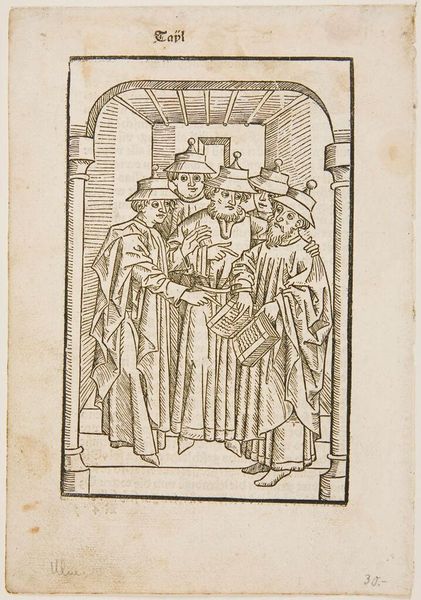 Curator: This print, titled "Letter Q," from an anonymous artist, presents quite the procession. Editor: My first impression is of a somber journey, almost a pilgrimage, framed by both nature and, dare I say, fate. Curator: Indeed. The figures, cloaked and hatted, descend a staircase within a circular border, embraced by stylized flora and fauna. Birds perch at the top, while the base curls like a wave. Editor: The birds could be interpreted as messengers, soaring above human affairs. And the staircase... are they ascending or descending? The ambiguity feels intentional, laden with symbolic weight. I wonder about the significance of Q as well. Curator: Perhaps it hints at a quest, a questioning, or a quality these figures possess or seek. I love the artist’s attention to detail, especially the intricate rendering of the robes. Editor: For me, I can almost hear the rustle of their garments and the quiet, inevitable rhythm of steps. It's both a celebration and a contemplation of the human condition. Curator: It’s a miniature world brimming with symbolic potential. Editor: A fleeting meditation caught within the confines of a letter.