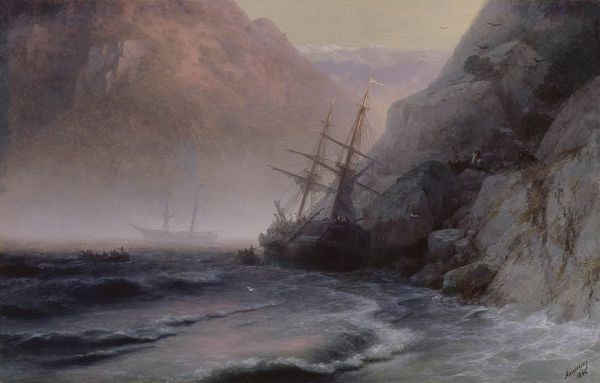 Ivan Konstantinovich Aivazovsky painted "Shipwreck on a Rocky Shore" using oil. The eye is immediately drawn to the dramatic interplay between the turbulent sea and the jagged, imposing cliffs. A palette of blues, greens, and grays evokes a sense of foreboding and the sublime power of nature. Notice how Aivazovsky uses the contrast between the small lifeboat, dwarfed by the immensity of the sea, and the towering cliffs to create a visual metaphor for human vulnerability. The composition, with its diagonal thrust of the waves and the verticality of the cliffs, destabilizes any sense of calm, immersing us in the chaotic scene. The brushstrokes, particularly in the rendering of the waves, are loose and expressive, suggesting the constant motion and instability of the water. The dramatic chiaroscuro, with light breaking through the dark clouds to illuminate the struggling figures in the boat, underscores the precariousness of their situation. This painting engages with the romantic tradition of depicting nature as an overwhelming force, a theme that resonates with philosophical ideas about the limits of human control. The formal elements of color, composition, and light converge to create a powerful statement about humanity's place within the vast and indifferent cosmos.