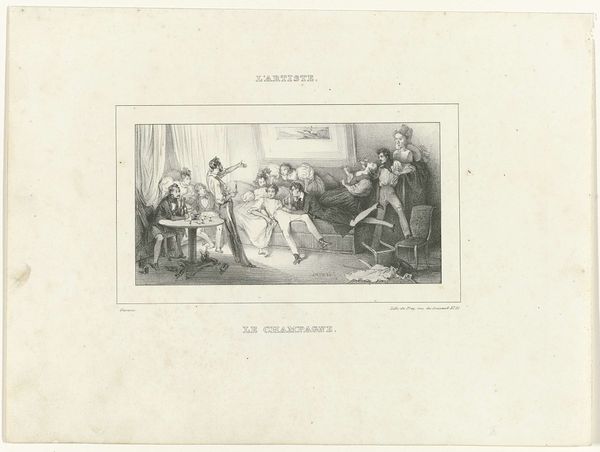 Curator: Our attention is drawn to a later print reproduction of Jan Steen’s painting "Interior with a Woman Feeding a Parrot, Two Tric-Trac Players and Other Figures," more commonly known as "The Parrot Cage", dating from around 1865 to 1875. It’s an engraving rendered in the style of the Dutch Golden Age. Editor: It immediately strikes me as chaotic yet charming. The composition, while clearly structured, feels bursting with activity and everyday drama. The light and dark contrast directs my eye. Curator: The narrative scene offers insight into Dutch domestic life during the 17th century. Steen was renowned for depicting relatable, often humorous, situations within middle-class households, frequently imbuing them with moral undertones. Note, the "tric-trac" game suggests leisure, perhaps excess. Editor: Excess, indeed! Look at the overturned stool, the child fiddling with scraps on the floor, and then the elevated parrot in the cage...a visual hierarchy seems present. I observe a subtle tension created by placing the dark background elements against brighter foreground figures; the lines generate a contained disarray. Curator: You point out the contrasts, the light and shadow not only emphasize forms, but create a setting that reinforces prevailing societal norms; gendered spaces—domestic work and familial concerns presented on the one hand versus leisurely games played by men, set further back in the scene. Editor: A sense of depth definitely resonates; the layers are more than physical arrangement. Each glance into the artwork suggests narrative levels I have yet to decode. It moves past the surface level of mere illustration and presents an investigation of form and meaning intertwined within societal constraints. Curator: I concur. Viewing this photographic reproduction helps us further examine 19th-century interests in Dutch Masters. Through reproductive engravings and other media, these popular narratives became accessible to wider audiences, underscoring an art historical continuity. Editor: Yes, a fascinating print to engage with: both in itself as a work of detailed artistry, but also to trace and contextualize how older imagery resurfaces and reshapes meaning. The careful rendering compels scrutiny beyond simple illustration.
