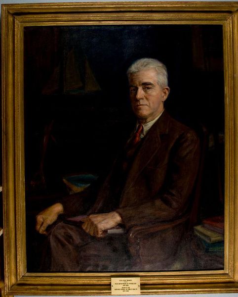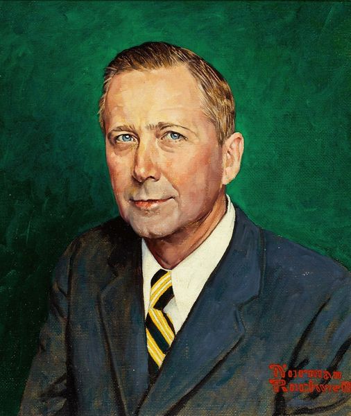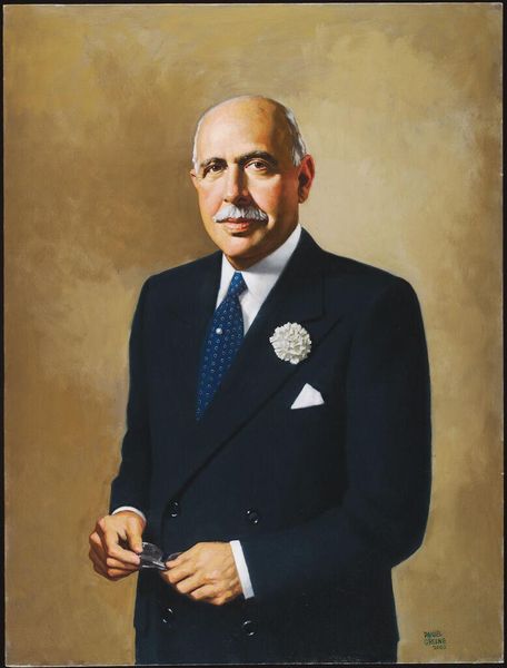 Curator: Here we see Daniel Greene's portrait of Robert B. Goergen, who served as the Chairman of the Board of Trustees for the University of Rochester. Editor: Immediately, I’m drawn to how the suit both dominates and almost dissolves into the background, that striking pinstripe blurring the edges. Curator: It's interesting you note that; the brushstrokes in the background *do* create this swirling, almost atmospheric quality. Greene seems less concerned with crisp lines here. He’s more about capturing a certain... presence, wouldn’t you say? Editor: Definitely a focus on presence, but I also see how this work reinforces certain structures. Oil paint is used here for official portraiture—linking Goergen with a historical lineage of power and status. Look at the hand positioning and the luxurious materials; every aspect broadcasts wealth and control. Curator: And yet, within that controlled image, I find flickers of something more intimate. There’s a warmth in the subject's gaze, a slight smile... Almost as though he is personally inviting the viewer into a candid and casual setting. Editor: Perhaps, but the material choices argue otherwise. The fact that the University commissioned and possesses this work reinforces the role of institutions in shaping visual narratives and legitimizing certain forms of capital. Oil painting isn't just *there*; it actively *performs* its role. Curator: True, but perhaps the point isn't just about celebrating power. Perhaps it's an attempt to capture a moment, a life… Even within the rigid framework of the commission. After all, paint, brushes, the artist's hand, are physical things put to use. It’s difficult, even with such formality, not to recognize the act of crafting a personal image. Editor: A valid observation. Still, I wonder if, with these types of pieces, we sometimes overlook the subtle ways in which these choices around materiality subtly contribute to the maintenance of hierarchical structures. Curator: And I think about how the sitter maybe felt as he donned a formal suit, maybe even reluctantly so! Editor: Perhaps, now to go deconstruct another portrait, shall we? Curator: It would be my pleasure!