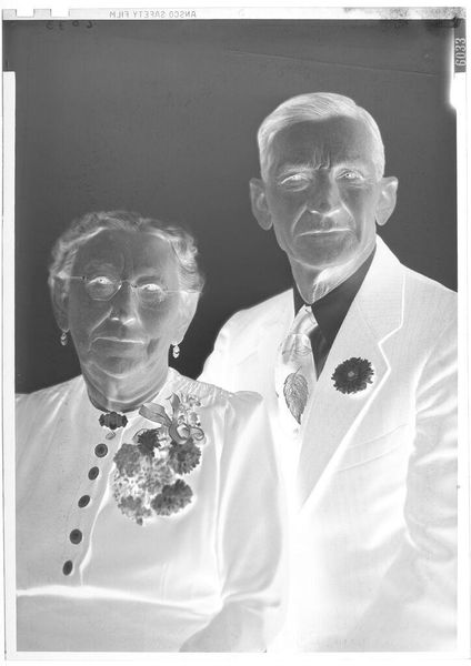 Curator: This piece, "Untitled (portrait of man and woman)" by John Howell, presents us with a fascinating study in contrasts. The inverted tonality immediately strikes me. Editor: I know, right? It's like looking into a ghostly mirror. You almost feel like you shouldn't be seeing them, some long-lost memory brought to the surface. Curator: Precisely. The reversal disrupts our conventional reading of portraiture. The composition is formally balanced, but the values destabilize it, creating tension. Editor: I wonder what they were like, this couple? His jacket looks so proper, and her top is tied so sweetly. Are they happy, or just posing? It's all so wonderfully ambiguous. Curator: The lack of a date also complicates interpretation. We can infer a mid-20th century timeframe from the clothing, but the image resists easy categorization. Its semiotic opacity is its strength. Editor: Yeah, it's like a puzzle with pieces missing. I think that's why it's so alluring. It lingers, almost begging you to invent their whole story. Curator: Indeed, and that interplay between absence and presence—between what is shown and what is implied—makes it an enduringly compelling photographic object. Editor: For me, I'm just struck by how the artifice of the photograph hints at the real lives underneath. It’s like they’re still here, watching us from the other side.