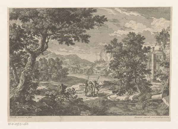 Curator: Look at this incredible print, "Mercurius, Argus en Io," believed to be created sometime between 1613 and 1695 by Nicolas Perelle. What strikes you most about this landscape engraving? Editor: The stillness. A drowsy kind of scene, where even the air seems to hold its breath. It's all these intricate, delicate lines, like secrets whispered onto the page. And that cow, lounging in the middle. So placid. Almost painfully unaware, wouldn’t you say? Curator: Absolutely! It depicts a moment from Ovid's *Metamorphoses.* Jupiter has transformed Io into a cow to hide her from Juno’s wrath. Mercury, tasked with freeing Io, is here charming Argus, the many-eyed giant guarding her. It's about deception, disguise, and transformation. Think about it, the landscape itself acts as a silent witness to this divine drama. Editor: Oh, yes, the ever-watchful eyes! I love how Argus is half-dozing, lulled by Mercury's…pipes? The serpent winds itself around a tree, it must carry some narrative burden… there’s a potent symbolism here, don't you think? Is it about to pounce, bringing that ancient chaos of the subconscious to the surface? It's almost unsettling amidst all the calm. Curator: I see it a bit differently, as a Baroque celebration of landscape— where human drama unfolds within a divinely ordered nature. The classical figures, of course, point to the importance of allegory in Baroque art. Each element carries significant weight. Editor: You are right of course: even that faraway building can mean something…a monument or perhaps a sanctuary...The symbols point everywhere and nowhere…What I love about it is precisely its layered nature. Its symbols echo into eternity. Curator: Perelle manages to infuse a pastoral scene with these weighty themes. It's pretty genius, really. What do you take away from our quick dive into "Mercurius, Argus en Io"? Editor: Its evocative power lingers. It has opened up new rooms in my head today, inviting contemplation about fate and the stories we tell ourselves to navigate the world, doesn't it?