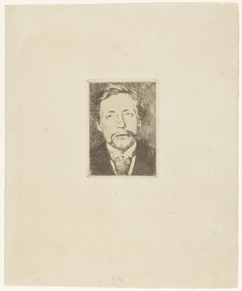 Curator: Looking at this powerful image, we have before us "Portret van Otto Barendsen," a print crafted in 1918 by Chris Lebeau. What's your immediate impression? Editor: Striking. The severe lines create an intensity; there's a strong contrast between light and shadow that shapes the figure. I immediately notice the somewhat unsettling gaze of the man. Curator: Indeed, it embodies an expressionist approach. Lebeau created this during a politically turbulent time. Given the socio-political context, the unflinching stare and rigid lines speak to the unease of the era, and perhaps, to Barendsen's own state of mind. Editor: From a formal point of view, the composition directs our attention through the contrasting textures. Look at the hatching work in his coat versus the intricate patterning in the background; it almost feels claustrophobic, further emphasizing his enclosed presence. Curator: That enclosed presence could represent the restraints imposed upon individual expression and liberty prevalent at the time. Lebeau, deeply involved in socialist ideals, often channeled those themes into his artwork. Editor: You know, the meticulous line work and graphic quality point towards a broader modernist aesthetic, stripping down detail to amplify emotional impact. Note the economical use of shadow to suggest the angles of his face—it's almost cubist in its simplification. Curator: It is also a departure from traditional portraiture norms of the time. The very act of depicting him this way challenged prevailing aesthetic standards. He was probably trying to connect with the social fabric and to make art a relevant participant within his era. Editor: I concur that its bold visual statement resonates with that historical imperative. From its severe lines to the sharp delineation of planes, the artwork creates a disquieting image that’s also formally captivating. Curator: It is this interplay between aesthetic and message that makes it such a compelling piece of social commentary. It gives you much food for thought about that historic period and its impact. Editor: Definitely. Lebeau’s focus on composition gives us the intensity, while its engagement provides a snapshot of art's social role. Curator: Very well said.