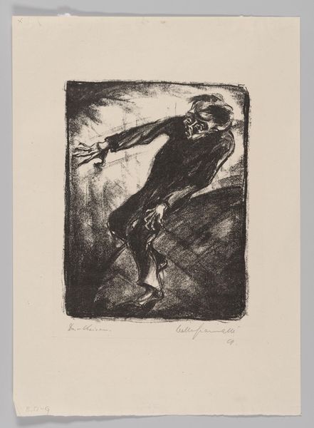 Editor: This is Ernst Ludwig Kirchner's "Stepptänzer" from 1914, a black and white print – either a lithograph or woodcut. It's striking how the figure seems to burst out of the dark background. What are your thoughts on this particular piece? Curator: Considering Kirchner's Expressionist context, look closely at the printmaking process itself. The harsh lines, the almost violent contrast – these weren't just aesthetic choices. How do you think the physical labor and materials used reflect the social turmoil of pre-war Germany? Editor: It does feel very raw and immediate. So, you're saying the roughness, even the imperfections in the print, aren't a flaw but part of the message? Like, the act of carving the wood itself mirrors the fractured society? Curator: Precisely! Think about the availability of materials too. Was wood more accessible, more "common" than other printmaking surfaces at the time? And how might that democratize the art, shifting it away from solely elite patronage? This piece invites us to investigate the means by which the image was produced and received. Who do you imagine consuming art like this and why? Editor: Maybe this was meant for the middle class, trying to make sense of rapid industrialization and societal change through a more accessible art form? A critique in print, affordable enough to spread around. Curator: That's a keen observation. It speaks to the potential of art as a commodity and an agent of social commentary, both deeply embedded in the materials and their circulation. Editor: I never really thought about the price of art materials as part of the art itself! It's fascinating to consider the physical object and its making as intrinsically linked to its meaning. Curator: Indeed. By considering labor and the means of production, we see "Stepptänzer" less as a portrait and more as a materialized reflection of a specific moment in history, a potent example of art interwoven with its socioeconomic fabric.