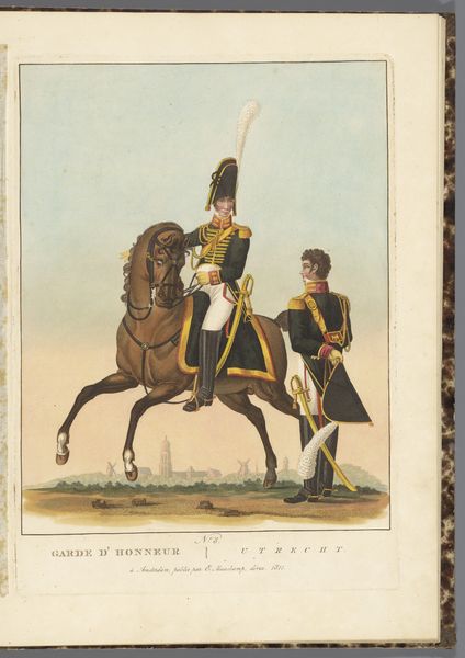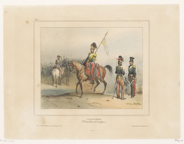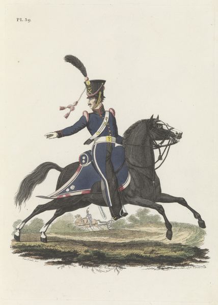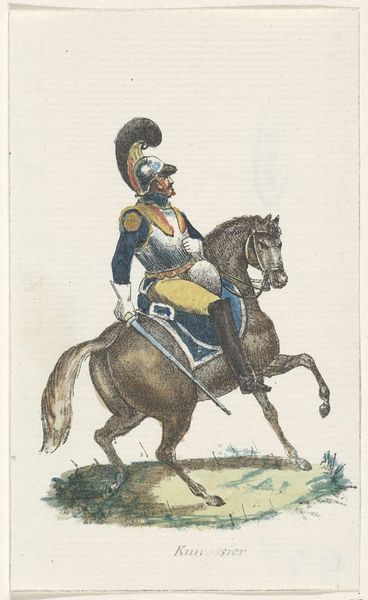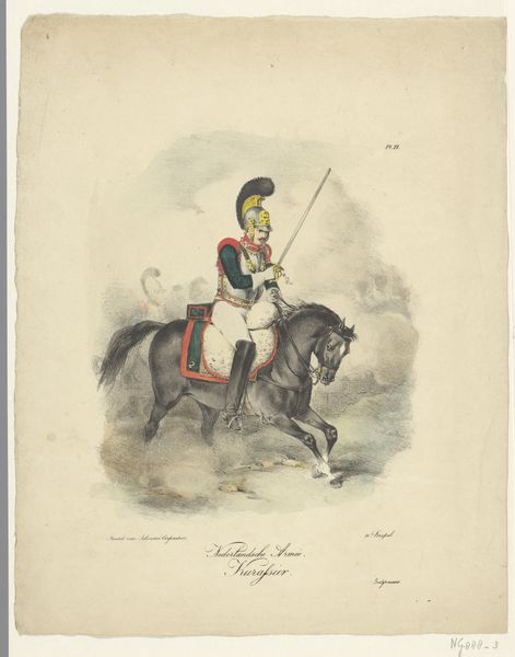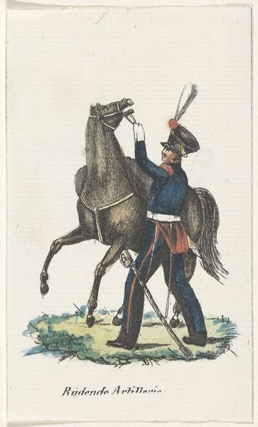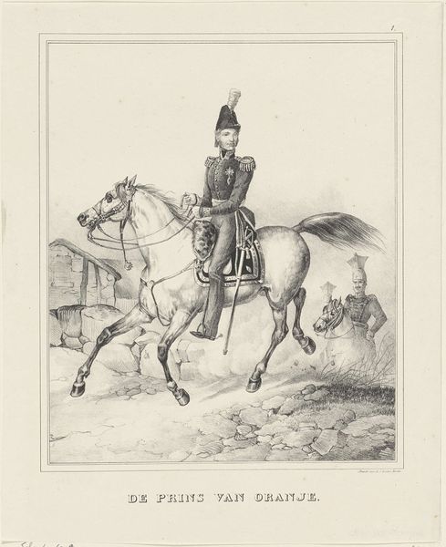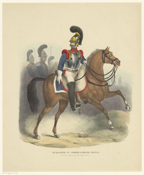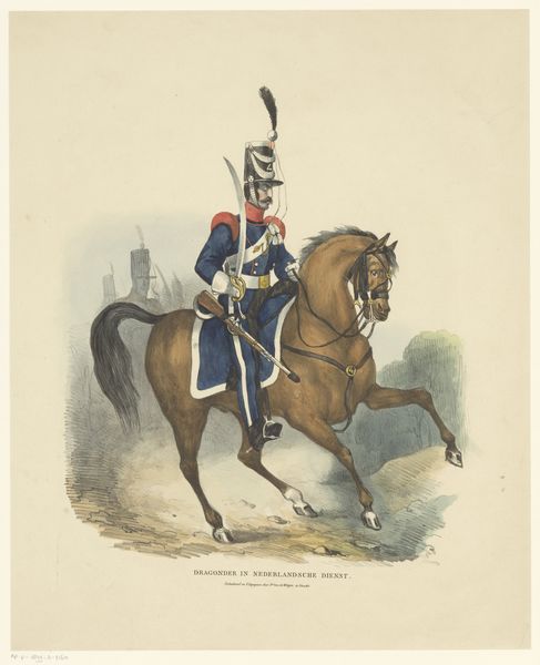 Curator: The first thing I notice about this work is the airiness. The subject is elevated above a muted landscape and appears to almost float—the colors and the style give the piece a weightless quality. Editor: Well, it is a watercolor, so a sense of lightness is perhaps inevitable, wouldn't you say? This is "Equestrian Portrait of Willem II, King of the Netherlands," dating roughly from 1847 to 1862. Curator: Ah, yes. The symbol of monarchy. What strikes me here is that, like many portraits of the time, the work immortalizes the image of regal, almost divine right through these very specific signifiers. It continues a lineage of visual language, wouldn't you agree? Editor: I think that's partially accurate. It’s also crucial to consider that Willem II's reign was marked by political and social changes, like the revisions to the constitution. I think this portrait plays into the complicated negotiation between the monarchy's perceived authority and those emerging demands for a more democratic process. Curator: You make a fair point. Yet, I still feel that the artist—whose name is, unfortunately, unknown—used symbols of status in a rather established way. The elaborate military attire, the rearing horse, the distant landscape… all familiar icons of power. The way he holds what seems to be a rolled-up letter hints at wisdom and order as well. Editor: Yes, and maybe there's also a subtle statement on duty in that gesture? Think of his involvement with military campaigns; such images were deployed for promoting his role as a national figurehead. How might the work operate if viewed from a post-colonial perspective, in consideration of his relationship with the Dutch colonies? Curator: Fascinating question. Perhaps the very posture we see embodies this power and his relation to it: he gazes straightforward, completely secure in his power… his identity. He projects authority. But thinking about your comment—his gaze would not extend toward all… it could mean subjugation for some. Editor: Right. He appears still relevant in many ways in his projection of power. It urges us to consider our relation to these forms of visual representation and to reassess whose stories are highlighted in these institutional spaces. Curator: Yes. This equestrian portrait echoes, and now, questions these archetypes. I see now, it certainly pushes one to examine art beyond its aesthetics. Thank you for adding an important perspective. Editor: My pleasure. Looking closely allows us to understand not only the artwork but its complicated legacy in contemporary discourses around identity, legacy, and power.
