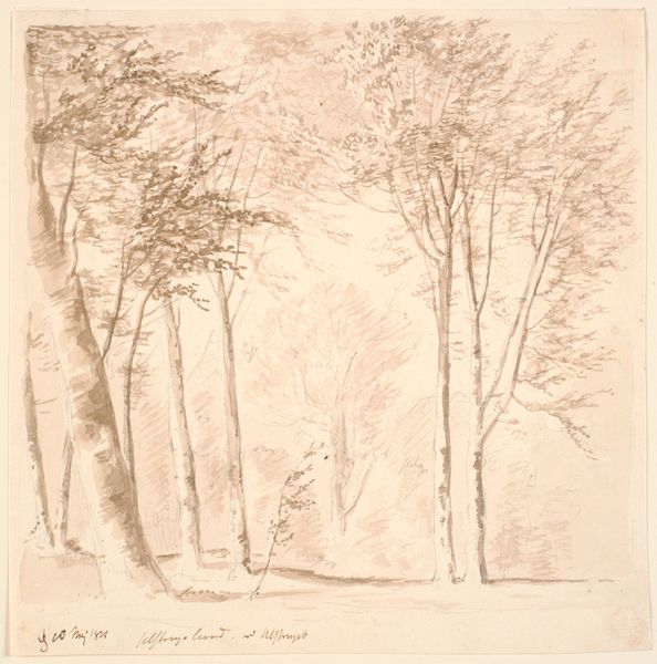 Editor: This is "Study of a Number of Heavy Tree Trunks" by Dankvart Dreyer, made in the 1840s, using ink and pencil. It feels incomplete, almost like a fleeting thought captured on paper. What can you tell me about it? Curator: Incompleteness, or rather the sketch, reveals much. Consider Dreyer's Denmark: a nation grappling with its identity amidst rising nationalism. He was recording a specific Danishness, rooted in its soil. His landscapes, like this one, were calls for cultural awareness, locating belonging through nature. What do you notice about his choice of trees? Editor: They’re bare, suggesting winter or a difficult season. Curator: Exactly! Nature isn’t simply beautiful here. Instead it symbolizes vulnerability, a starkness. He seems to ask, what are the forces threatening them? Think about that in relation to Denmark’s precarious political standing during that era. Is this simply a depiction of nature, or is it about Denmark's political ecology, its struggle to survive as a nation? Editor: So the seemingly simple choice of subject – trees – is loaded with political meaning. Is that typical of landscape art from this period? Curator: Absolutely! Landscape painting in this era was more than picturesque. They often served to establish a sense of cultural identity and belonging. Editor: It's fascinating to see how nature, even in its simplest form, can be a reflection of political struggle and national identity. I never would have guessed there was such complexity behind the artwork at first glance! Curator: Precisely! Art is seldom just surface; it's a conversation with the times, inviting us to decode its layers.