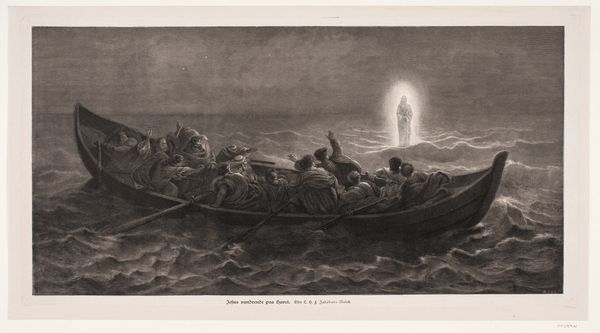 Curator: Here we have Edward Moran's "Untitled (Launching a Dory/To the Rescue/Shipwreck)," an engraving dating to 1895. The multiple titles suggest the thematic ambiguity of the work itself. Editor: It evokes a very particular feeling, doesn't it? Somber, melancholic…almost cinematic in its depiction of collective struggle against a threatening, imposing natural force. Curator: Observe the interplay of light and shadow—the moon struggling against the oppressive clouds. Note how this directs our gaze through the composition. The light falls across the faces of the men. Do you think Moran employs chiaroscuro here, typical of romanticism, to highlight their expressions of grim determination? Editor: Yes, the human endeavor against the backdrop of a dangerous sea does have those overtones of Romanticism and also something very visceral regarding gendered labor and collective identities. Consider these working-class figures engaged in their physically demanding labor under treacherous conditions, emphasizing their interdependence. I see solidarity but also the inherent dangers faced by maritime communities of this era. Curator: Agreed. The etching method allows for a remarkable level of detail, capturing the textures of clothing, the grit of the beach, the stormy quality of the sea. And it makes evident their coordinated movements to launch the dory—note the rhythmic composition with each person carefully rendered and interconnected through lines and implied perspective. Editor: Considering the time this was made, it also encourages consideration of class dynamics inherent to such endeavors. Are they driven by a sense of responsibility for one another, or merely because their survival depended on such labor? One wonders, what are the support structures for the families who lose these members on the sea? I see resilience here but with underlying vulnerability, perhaps even a subtle criticism. Curator: Very perceptive, your focus on social implications. I was moved by the contrast in values between the ethereal moon and weighty physicality of the men laboring under its wan light. I also want to notice the balance— between the overall gloomy dark tonalities against strategically illuminated figures. It certainly makes this image dynamic, don't you agree? Editor: Undoubtedly, though beyond a study of tone, the engraving calls for consideration of the sociopolitical and intersectional dynamics represented. Who owns these boats? What safety measures are offered to the lower ranks risking their lives at sea? What were the safety protocols in 1895 and are there historical resonances relevant to current labor relations in fisheries around the globe? Curator: These points make for a very nuanced and timely reading. A close visual examination reveals how effective art becomes a conduit to further questioning.