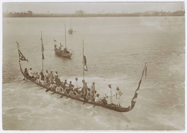 This photograph captures boats filled with local residents alongside a large steamship. The flags, symbols of national identity and power, immediately draw our attention to the complex dynamics at play here. Consider the flags that flutter atop the boats, emblems of nationhood and authority. These symbols can be traced back through history, echoing in medieval banners and Roman standards. The act of displaying a flag has always been a declaration of presence, a marking of territory, and an assertion of dominance. Flags, initially symbols of unity, can evolve into emblems of division and conquest, reminding us of the cyclical nature of power and identity. This tension – between belonging and exclusion, authority and subjugation – engages us on a subconscious level, stirring primal emotions linked to our own sense of place and identity. Like a recurring dream, such symbols persist, shape-shifting across time and culture, always carrying the weight of history within them.