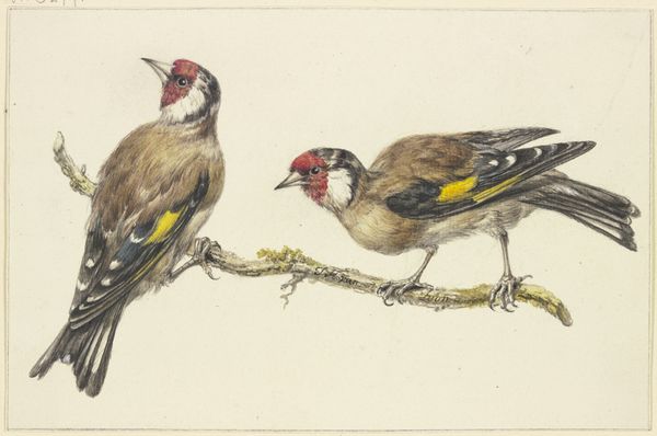 Aert Schouman made this watercolor of two goldfinches, but we're not sure exactly when. This image gives us insight into the culture of natural history and collecting in the Netherlands during the 18th century. The detailed depiction of the birds reflects the growing scientific interest in the natural world. This was a time when wealthy individuals often kept private collections of specimens and commissioned artists to document them. The presence of goldfinches might also reference broader social and cultural associations. In some contexts, these birds symbolized good luck or were kept as pets for their song. Schouman himself was a glass painter, and this watercolor showcases his detailed skill and ability to capture the delicate beauty of nature. Understanding an artwork like this requires that we examine the artist's training, the collecting practices of the time, and the cultural symbolism attached to the depicted subjects. This helps us appreciate how art reflects and shapes our understanding of the world.