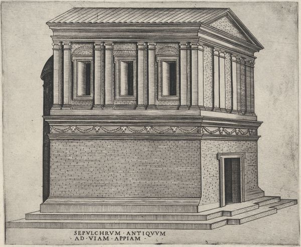 Curator: Here we have "Speculum Romanae Magnificentiae: Maison antique a Nymmes," dating from sometime between 1530 and 1580. It's attributed to an anonymous artist, executed in a drawing and print medium. The scene features a formal view of an ancient building facade, perhaps offering us a look into Renaissance understandings of the classical world. What do you think of it? Editor: Initially, it feels austere. The crisp lines and lack of ornamentation give it a severe elegance, a real monumentality but also a curious sense of flatness. The repetition of those columns is strangely hypnotic, creating this somewhat lifeless rhythm across the surface. Curator: That's a sharp observation. The image does reflect a desire to accurately document Roman antiquity during a period of intense architectural revival. These “speculum” prints were a means of virtually experiencing and disseminating the grandeur of Roman ruins when travel wasn't accessible. It spoke volumes about power. Editor: Indeed. And the absence of figures, or any visible social activity, adds to the solemn tone. It seems to speak to an interest in the architecture for architecture's sake; there's something quite masculine, quite colonial about that kind of decontextualized appreciation. As if the stones were being admired in the abstract, scrubbed clean of the lives that once animated them. Curator: I hadn't thought about that reading in the colonial lens, but it aligns with contemporary conversations around whose stories are valued and made visible. This print then can be examined as an exercise in idealizing, and perhaps sanitizing, a particular historical narrative and reinforcing it through imagery accessible across a range of audiences. The focus is resolutely on form. Editor: Yes, even that stark use of line work feels imbued with power. By stripping away anything that could suggest a more embodied experience of the structure – the smells, sounds, or lived realities – you're left with something closer to an abstract idea of ‘Rome’ which has real bearing on how it was conceived. Curator: Precisely. Seeing this drawing now forces us to think critically about who crafted it, who consumed it, and the values it projected during its time and continues to uphold centuries later. Editor: Absolutely. What initially seemed like a simple architectural study reveals layers of cultural and political complexity, encouraging us to interrogate the visual languages of power embedded within art history.