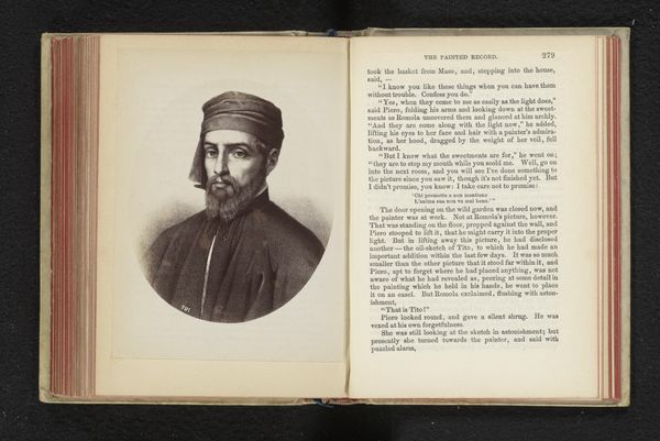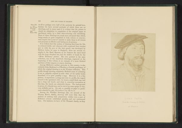 Curator: Well now, here’s something intriguing. Before us, we have an image of "Mr. Morrett." A drawing, I believe, on paper and turned into a print at some point before 1867 and now at the Rijksmuseum. He looks quite… stern, wouldn’t you say? Almost like he’s peering into your very soul, though it’s rather faded with age and being bound in this book. What strikes you most about it, as a budding art historian? Editor: He does have an intensity about him, even in the print! I'm intrigued by the detail in his beard and cap versus the relative lack of definition in his clothing. How would you interpret the choice of medium and the detail in rendering "Mr. Morrett," Curator? Curator: The choice of a print is really quite curious. The immediacy of the artist’s hand in drawing offers an intimacy lost in more formal portraits, don’t you think? Especially combined with the history, one gets a distinct feeling that you might even be having tea with this rather stern and forbidding Renaissance figure in your favorite dream. The artist focused on the face to draw the viewers in, as it’s here the figure comes alive! What does the title tell us? Editor: That makes perfect sense! The title leads me to believe it might be a study or perhaps even a preparatory sketch for a larger painting. It’s fascinating to think of this level of detail going into what might have been a small part of a much grander scheme! Curator: Exactly! A delicious detail lost to time. That touch of informality adds such charm to an otherwise slightly intimidating fellow, doesn’t it? These hidden sketches are some of the most important works to uncover history. Editor: It certainly gives you a different perspective on art! I will have to study other informal sketches of this time. Thank you!