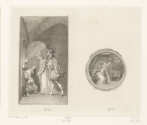 Curator: It strikes me as intensely intimate despite the historical subject matter. All those tiny, delicate lines create this incredibly fragile atmosphere, like a half-remembered dream. Editor: Indeed. What you're experiencing there is Burney's skillful execution of the romantic style in this print, whose full title is “Berenice, wife of Antiochus Theos, and her son take refuge in Daphne,” which dates from around 1790 to 1800. It depicts Berenice and her son seeking sanctuary, as the title suggests, and presently calls the Met in New York its home. Curator: Sanctuary feels like the perfect word here. Look at the way she clings to the child, that protective embrace, as if all the world's sorrows have settled on her shoulders. And that distant, almost ghostly cityscape – it’s all so evocative. Editor: Well, Berenice was indeed in a precarious position. Antiochus Theos, her husband, had been induced to restore his divorced wife Laodice to favour, which resulted in Berenice and her child's endangerment after Antiochus's death, according to historical accounts. The refuge becomes more than physical. The telescope adds an additional layer, inviting us to seek solace, perhaps even meaning, in the stars. Curator: The presence of a telescope next to what seems to be their sanctuary, however, feels slightly odd, especially considering Berenice was supposedly famed for sacrificing her hair. Is it meant to represent more than just earthly refuge? Editor: That's where it gets fascinating, isn't it? This symbol could hint at aspiration beyond earthly difficulties, as the narrative may point towards divine protection during her flight. Remember, the story is filtered through Burney's own time, shaped by his perspective on power, family, and resilience, with an implicit reference to the myth of Daphne. It prompts reflection on how we mythologize history to address present needs, with the figure of Berenice as a point of connection. Curator: So, the cultural memory and artistic interpretation begin a dance of their own. That’s the wonder of historical narrative in art – the convergence of then and now. Editor: Precisely. Each viewing brings a new facet to light, offering timeless insights into the human quest for solace. Curator: A small engraving with a big echo. Editor: A refuge indeed for thought and emotion.