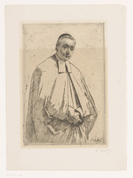 This is van der Straalen's "Bust of a Monk," a drawing rendered with ink on paper. The image is dominated by the monk's head and upper torso, depicted in profile, facing left. Notice how the artist uses line to convey form and texture. The lines are not uniform; they vary in thickness and density. The monk's beard, for instance, is rendered with short, wiry lines that create a sense of volume and roughness, a play with depth that enlivens the figure. Lines also radiate at the top left, perhaps indicating light, yet their abstraction pulls them from pure representation into a graphic element that interacts with the rest of the composition. The hatching is particularly intriguing; it suggests depth and shadow but also flattens the image, drawing attention to the surface of the paper itself. This tension between depth and flatness, representation and abstraction, invites us to consider the act of drawing itself. Is it simply to mirror reality, or to engage in a dialogue between the artist, the subject, and the medium? This artwork functions as a visual sign, capable of multiple readings and interpretations.