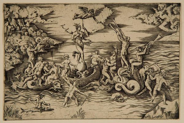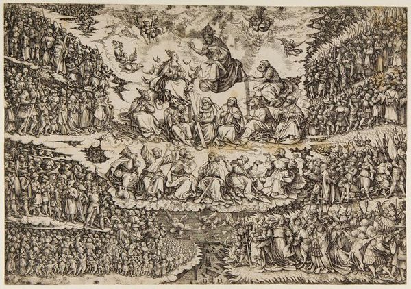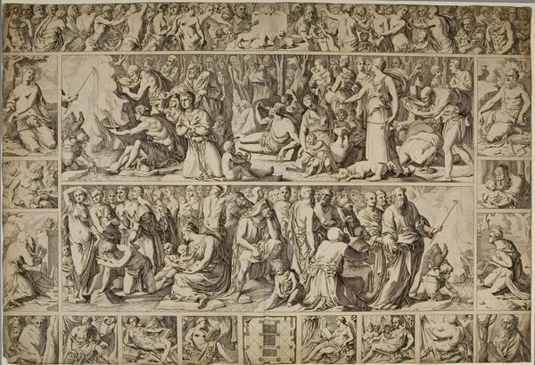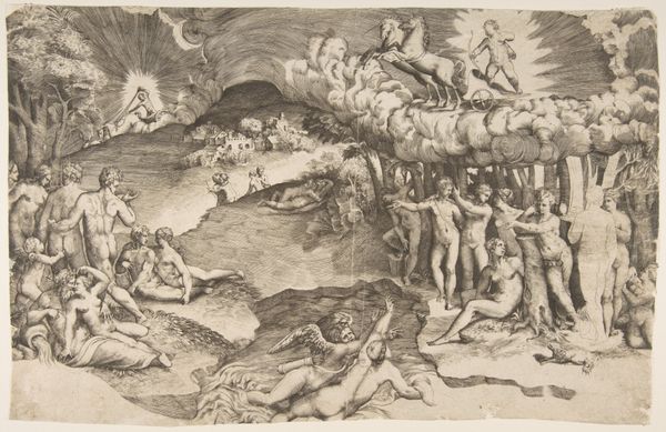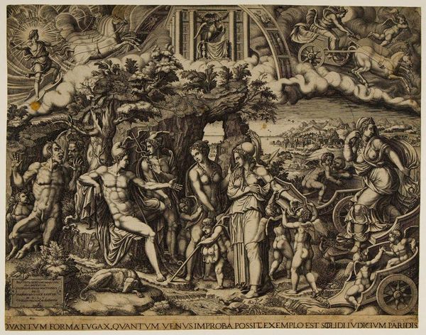 Editor: Here we have Laelius Cosatti's "Moses and the Tablets," a detailed print. It's quite the dramatic scene! What strikes me is the contrast between Moses, standing strong with the tablets, and the chaos surrounding him. What do you see in this piece? Curator: Ah, yes. It’s as though Cosatti has captured a pivotal moment, a clash between divine law and human frailty. Notice how the figures seem caught between reverence and revelry. Does it remind you of anything? Editor: Maybe a bit like a stage play, with all these actors portraying different roles in the story? Curator: Exactly! It's a snapshot of a community grappling with the weight of new rules, new expectations. I wonder, what rules do we grapple with today? Editor: That's food for thought. It’s amazing how a centuries-old artwork can still spark such relevant questions! Curator: Indeed! Art is a mirror, reflecting ourselves back through time.