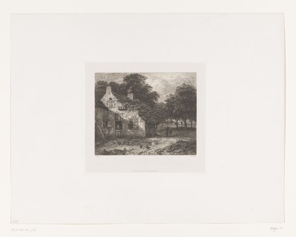 Pieter de Goeje’s etching, "Landscape with Watermill and Barn," presents a meticulously rendered rural scene where the interplay of light and shadow creates a tranquil, bucolic atmosphere. The composition is anchored by the structural forms of the watermill and barn, their thatched roofs and wooden textures delineated with careful precision. The artist's masterful use of line and shading invites us to explore the subtle gradations of tone, from the luminous highlights on the water's surface to the deep, shadowed recesses of the surrounding foliage. The geometry of the buildings contrasts with the organic forms of nature, creating a balanced yet dynamic visual experience. De Goeje’s careful rendering of detail—the texture of the wood, the flow of water, the play of light—speaks to the enduring artistic fascination with the mimetic representation of the natural world, a concern that occupied much of 19th-century art. The artwork captures a moment of serene contemplation, inviting us to reflect on the structural harmony between human construction and the natural world.
