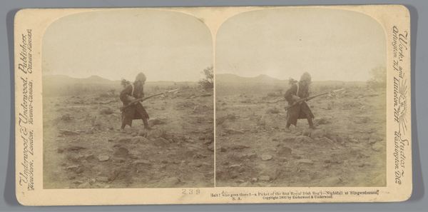 This vintage photograph, "Gezicht op Mbulwana vanuit de Boerenposities na de belegering van Ladysmith," made by an anonymous artist, captures a landscape dominated by browns, greys, and muted greens. It's a scene viewed from behind a stone wall, where a lone figure looks out towards a distant plateau. The texture of the wall is palpable; you can almost feel the rough, uneven surfaces of the stones. This granular focus contrasts with the smooth, expansive sky above. The composition is divided into distinct horizontal bands. The wall, the plain, and the sky. This makes me think about how we construct our own boundaries and limitations. The figure standing at the wall seems to be contemplating the space beyond, a metaphor for the unknown or the unattainable. This image reminds me of some of the quiet, contemplative landscapes by Agnes Martin, where simplicity and repetition invite a kind of meditative looking. What do you see?