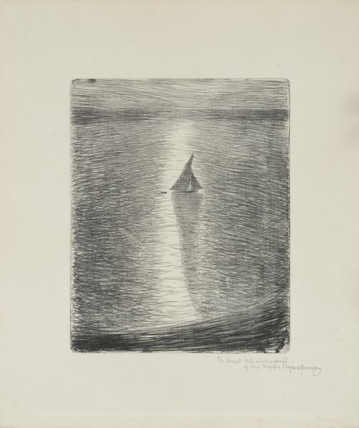 Editor: This is "Zeilschip nabij de kust in het donker," a print and etching by Omer Coppens, dating roughly from 1874 to 1909. It’s really evocative, quite mysterious… The muted tones and the lone ship on the water create this sense of isolation. How do you interpret this work within its historical context? Curator: That’s a keen observation about the isolation. I see this piece as an engagement with Romantic ideals, a period deeply concerned with humanity’s relationship to nature. This was a time when industrialization was rapidly changing the landscape, so artists often portrayed nature as a space for reflection, refuge, even confrontation with the sublime. Editor: So the ship isn’t just a ship; it’s representing something more? Curator: Exactly. Consider the sociopolitical climate. Coastal communities in Belgium, where Coppens worked, were experiencing profound shifts due to economic and social changes. The ship could symbolize exploration, but perhaps also the precariousness of life dependent on the sea. How does the work speak to Belgian national identity? Editor: Interesting. I hadn’t thought about it in terms of Belgian identity specifically. It's interesting how art reflects the hopes, and anxieties of the societies it comes from. I was focusing more on the visual elements, such as composition, light... Curator: But the visual elements reinforce these anxieties! The dark etching, almost a monochromatic scheme, and hazy forms contribute to the mysterious mood, evoking a specific sensibility in this period, how imagery may reflect or attempt to reinforce the period's socio-economic narrative. What will you take away? Editor: I see, considering how Romanticism was actually used as social commentary or as a critique of rapid societal changes. That's insightful; thanks!