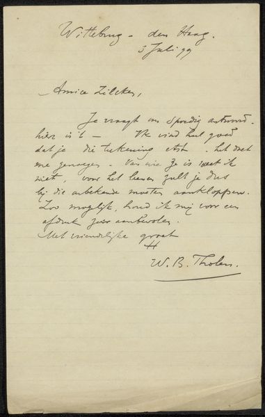 Editor: This is "Brief aan Frans Buffa en Zonen," or "Letter to Frans Buffa and Sons," thought to be from 1887 by Willem Bastiaan Tholen, done in pen and ink on paper. There’s something so personal about seeing someone's handwriting; it feels very intimate. What do you see in this piece, beyond the obvious of it being a letter? Curator: Well, you know, I immediately feel like I’ve stumbled into Tholen’s private world, his most vulnerable thoughts splashed across the page, as raw and unfiltered as morning light. It's a bit like finding a forgotten time capsule, isn't it? A snapshot of a moment frozen in ink. You can almost sense the artist’s breath as he meticulously forms each letter. It gives this incredible weight to each word and phrase. Editor: So, the act of handwriting itself becomes part of the art? Curator: Precisely! The choice of ink, the pressure he applied, the flourishes – they become a visual symphony, expressing perhaps more than the words themselves convey. Is the handwriting rushed, deliberate, even messy? What does that tell us? We should ask ourselves if that frenetic energy reflects urgency in the writer. This reminds us that creativity is not merely in grandiose concepts, but also within quiet acts. Even scribbling a letter. Editor: I never really thought about handwriting carrying so much artistic information! Curator: Life whispers its secrets through such modest art! Editor: Looking at something as commonplace as a letter in this new way changes how I look at everything else now. Thank you.