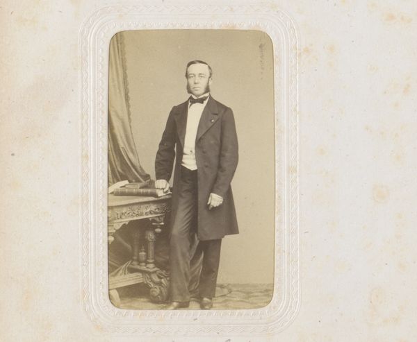 Curator: What strikes me first is the stark stillness—almost melancholy—in this gentleman's posture. Editor: I’m drawn in by this intriguing gelatin silver print, "Portret van een man met snor en bakkebaarden, staand bij een tafel," placing our sitter in the late 19th century, between 1860 and 1900. Think about the social conventions governing men's portraiture then! Curator: The texture created by the gelatin silver process is crucial; notice the way the light catches his dark jacket and the tassels of that drape. The photographer, A. Helm, uses this effect masterfully. Do you think there’s a performative aspect to this type of early photographic portraiture? Editor: Absolutely, given the long exposure times, he probably had to sit completely still for minutes. It would have demanded patience but also reinforces specific notions of middle-class masculinity, emphasizing composure and a very still stoicism in an era defined by the rise of industrial labor and bourgeoisie ideals. Consider the labor involved: from mining the silver, preparing the gelatin emulsion, taking, printing, to finally viewing and storing the image, each stage signifies specific levels of class mobility during a time of change. Curator: His carefully groomed moustache is an undeniable declaration, isn’t it? An expression of masculinity presented with the aid of professional barbering. The table looks commercially produced, too, doesn't it? How might photography be linked to the rise of manufacturing in the Victorian Era? Editor: This object provided a way for individuals, especially men, to perform certain class positions. Photography was a valuable material production; a business, trade, and source of commodified goods like the man’s clothing, side table, curtains and gelatin silver itself. The details tell an implicit narrative around what his labor means during times of change. It shows new markets forming. Curator: Viewing art objects through this industrialization lens changes our reading, indeed. The photograph becomes not just a representation, but also an artifact, revealing both individual intention, broader historical currents, as well as technological processes that shaped 19th century identity. Editor: It enriches the way we look. Now, it really compels me to dig into records to find him. His story is worth knowing.