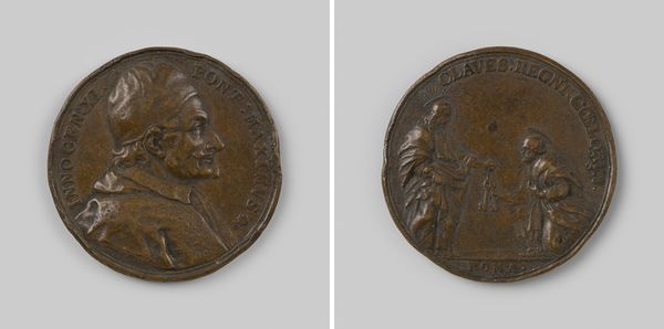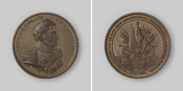 Curator: This bronze medal from 1620 commemorates the "Conquest of Two Algerian Ships by Captain Mooy Lambertz, in Honor of Prince Maurice." It offers us a fascinating window into Dutch maritime history and self-perception. Editor: It's a powerful little thing, isn't it? The subdued sheen of the metal, and those crisply rendered scenes give a sense of steadfast, enduring authority. The ocean looks rather tempestuous. Curator: Absolutely. The medal was created by Gideon d’Assigny and presents Prince Maurice, a significant figure in the Dutch Revolt, alongside this victory. But the ‘victory’ needs unpacking. We must situate it within a period rife with religious conflict, colonial ambition, and brutal power dynamics, notably the rise of European maritime power and its interactions, shall we say, with the North African coast. Editor: It’s interesting to me how victory is symbolized here. On one side we have a stately, classically-inspired portrait of the Prince, but the other offers a dynamic, if miniaturized, scene of naval conquest. Do those ships represent an actual historical event, or were they designed as a representation of Dutch Naval superiority? Curator: Likely a rendering of a specific event, used to amplify Dutch prowess and reinforce a specific, and of course biased, narrative of righteous triumph, crucial for bolstering national identity during the Eighty Years' War. It’s interesting to note the textual details which circumscribe both scenes; on one side celebrating Prince Maurice, and on the other detailing the date and significance of the naval victory. What ideological work were these types of commemorative objects achieving at the time? Editor: And were such medals only displayed, or were they also handled? Passed around to further amplify the emotional effect? It seems like the tactile experience would enhance the symbolic power, anchoring this event as both history and propaganda. You have this victorious image, small, but made permanent in metal; weighty, tangible proof of power. Curator: Indeed. Today, such objects serve as poignant reminders of the complex intersections of art, power, and history, demanding that we analyze the narratives they promote. Editor: Looking at this medal allows me to consider the emotional lifespan of an object like this: designed to rally patriotic sentiments, later collected, examined and now analyzed within an entirely new framework. The layers of meaning are fascinating.