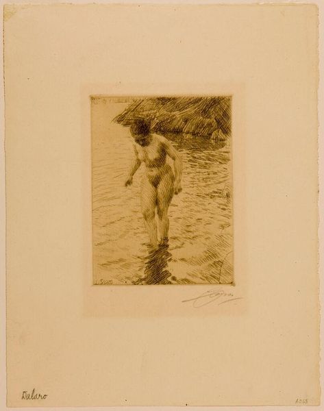 Editor: Here we have Henri Fantin-Latour's "Standing Bather, third plate," a lithograph from 1899. The woman is depicted from behind, her arms raised, with soft, hazy lines defining the landscape and her form. I'm struck by how vulnerable yet strong she appears. What layers of meaning do you find in this piece? Curator: This work resonates with the complex history of representing women in art, especially within the Impressionist movement. How does Fantin-Latour challenge or perpetuate the male gaze? Consider the title, seemingly objective, juxtaposed against the intimate portrayal of the female form. Editor: I see what you mean. It feels less like an intimate moment and more like observation. Curator: Exactly. And what about the societal constraints placed upon women in the late 19th century? The bather motif, a classic art historical trope, is here reimagined through the lens of a rapidly changing world. Do you think Fantin-Latour uses this historical context to critique or uphold traditional power structures? What's the implication of presenting this scene in a print? Editor: It is so interesting to consider how the artistic choices reflect societal attitudes toward women. I hadn't really thought about that when I first looked at it. And its existence as a print suggests its mass availability to those social structures. Curator: Precisely. By engaging with these questions, we can better understand how art serves as a mirror reflecting—and sometimes refracting—the complexities of gender, power, and identity. Editor: This has given me a new lens through which to examine not only Fantin-Latour, but other Impressionist works, too! Thanks for opening my eyes.