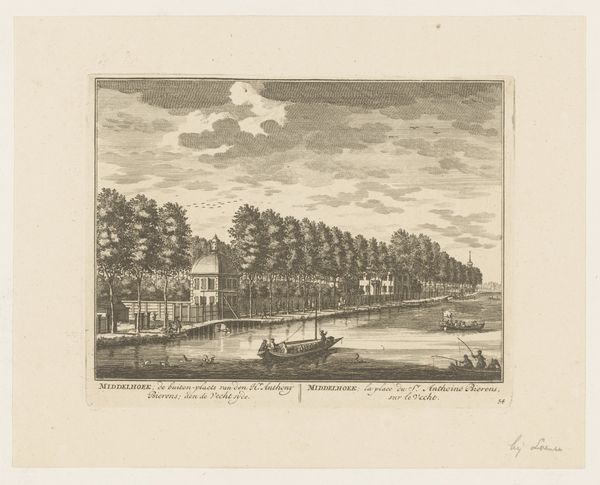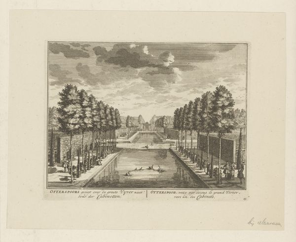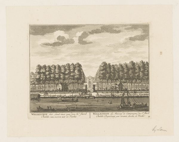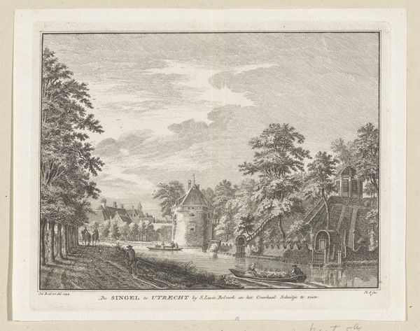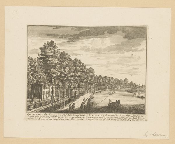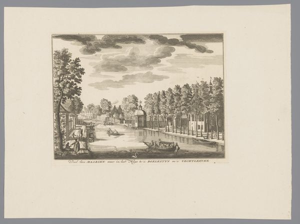 Editor: So, this is "Gezicht op Goudestein," an engraving made in 1719 by Daniël Stopendaal. It's a detailed cityscape, and I’m struck by how it presents this idealised view of leisure and prosperity. What stands out to you in this image? Curator: Immediately, I see the way the print mediates social status in the Dutch Golden Age. Consider the very act of commissioning and disseminating such an image. It speaks volumes about the patron’s desire to project power and taste. How does the setting contribute to that projection? Editor: I guess the orderly canal and the meticulously rendered buildings suggest control and wealth. The figures strolling casually along the waterway also paint a picture of serene upper-class life. Curator: Precisely. And notice how the landscape isn’t merely a backdrop but a carefully constructed stage. The politics of imagery in this era were heavily influenced by wealthy patrons who wanted to broadcast their values. The museum itself, displaying this image centuries later, continues that act of making the private public. How do you see this image interacting with the museum space now? Editor: It makes you wonder about the ethics of displaying such potent imagery, almost romanticizing a history built on potentially unequal power dynamics. But perhaps displaying it allows for that critical examination? Curator: Indeed. We learn as much from the visual culture as we do from written records about how societal structures were maintained. Examining the public role of art like this gives us the ability to critique these portrayals. Editor: This has shifted how I perceive these seemingly quaint cityscapes. There’s a lot more to consider below the surface! Curator: Absolutely. Engaging with the social and historical contexts transforms a simple landscape into a complex historical document.