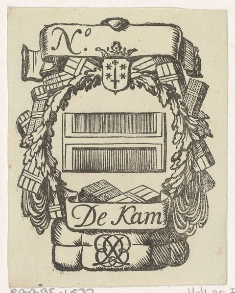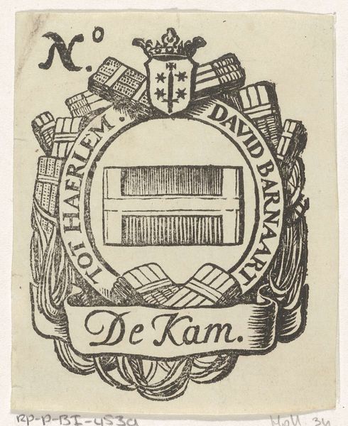 Editor: This is "Handelsetiket van David Barnaart," a drawing, likely an engraving or print, made by Isaac Vincentsz. van der Vinne sometime between 1681 and 1740. It looks like a kind of emblem, maybe for a business? What kind of symbolism can you read in this image? Curator: The symbols resonate with commerce and civic identity. Consider the prominent depiction of what appear to be wool bundles or textile rolls—these would speak directly to the mercantile trade, perhaps of a cloth merchant. And notice how they're framed? Editor: By… what looks like weaponry? Or tools? Curator: Indeed. These bundled tools suggest craftsmanship, labor, and potentially guild affiliation. The juxtaposition of these elements – the raw materials and the tools – allude to production and prosperity rooted in skill. What emotional resonance does that imply? Editor: I guess a feeling of established importance. The banners add a celebratory element, while the family crest with the crown suggests aristocracy. There's an interesting mix of class symbols at play here. Curator: Precisely! It demonstrates the growing power of merchants who sought to align themselves and their status with aristocracy. Consider how images, in particular, can contribute to the construction of identity, and how seemingly disparate objects, when combined, carry layers of historical information. How does knowing that change how you interpret this graphic art? Editor: I see now how loaded even seemingly simple designs like this are. The artist combined recognizable elements to represent a sense of authority and aspiration for this trader. Thanks! Curator: The act of visually constructing social standing remains timeless!
